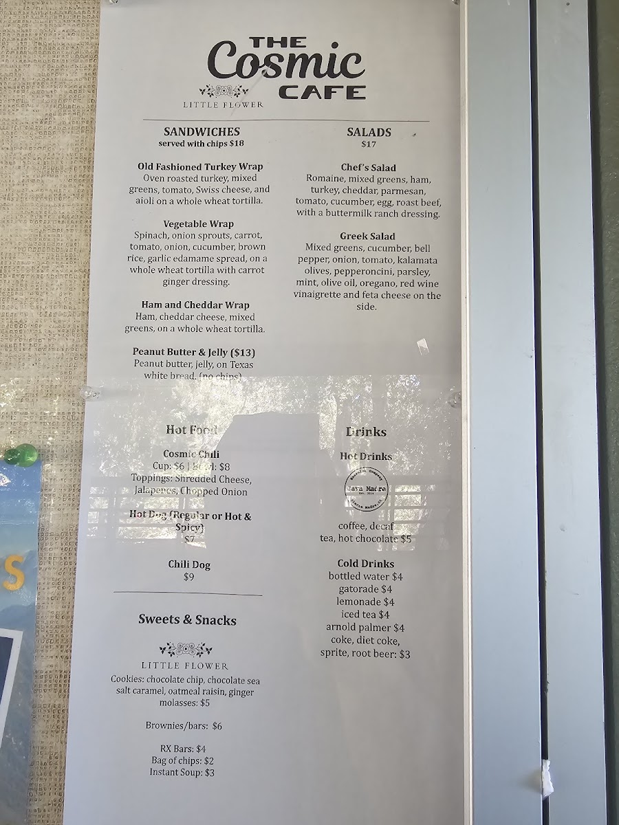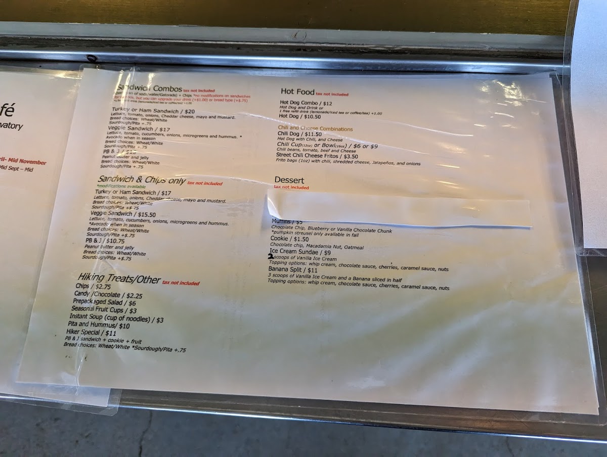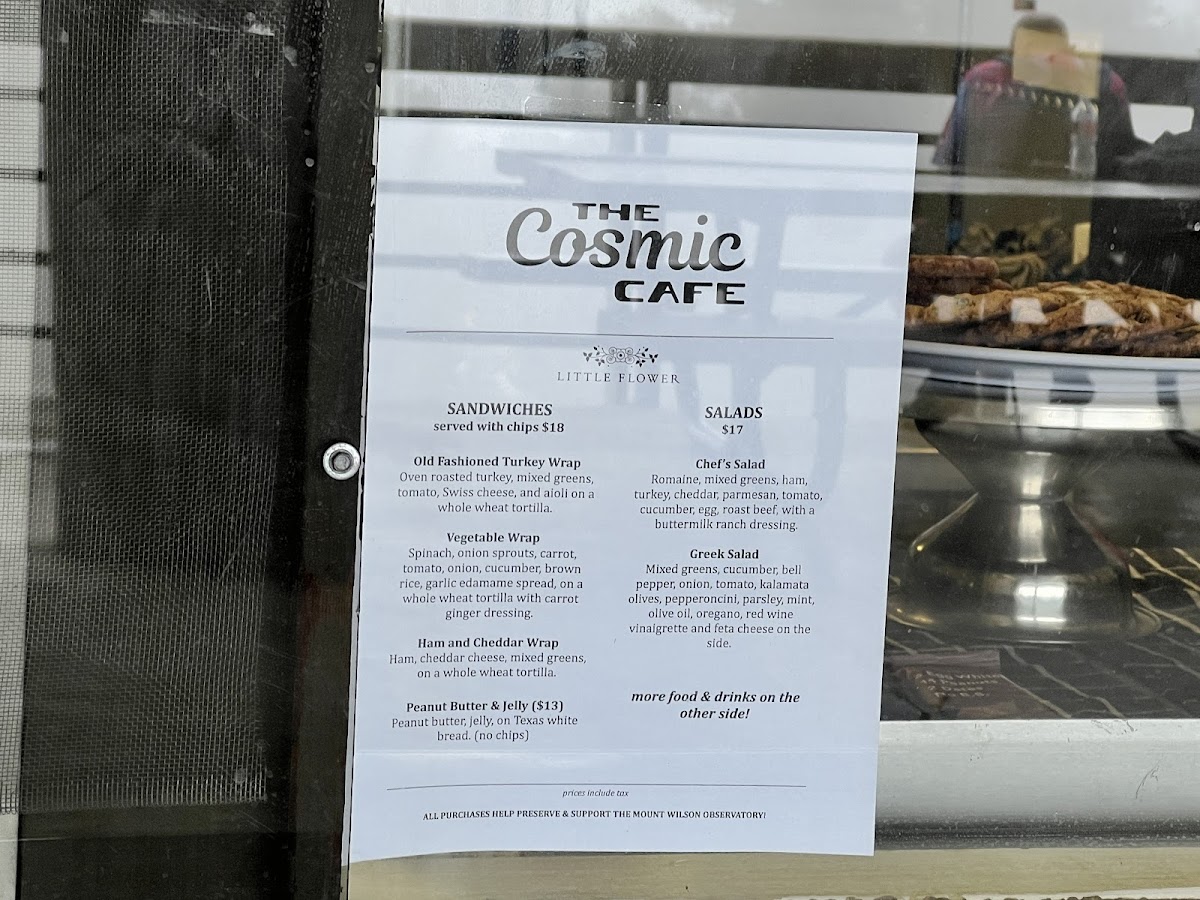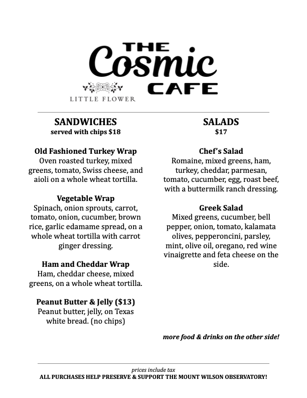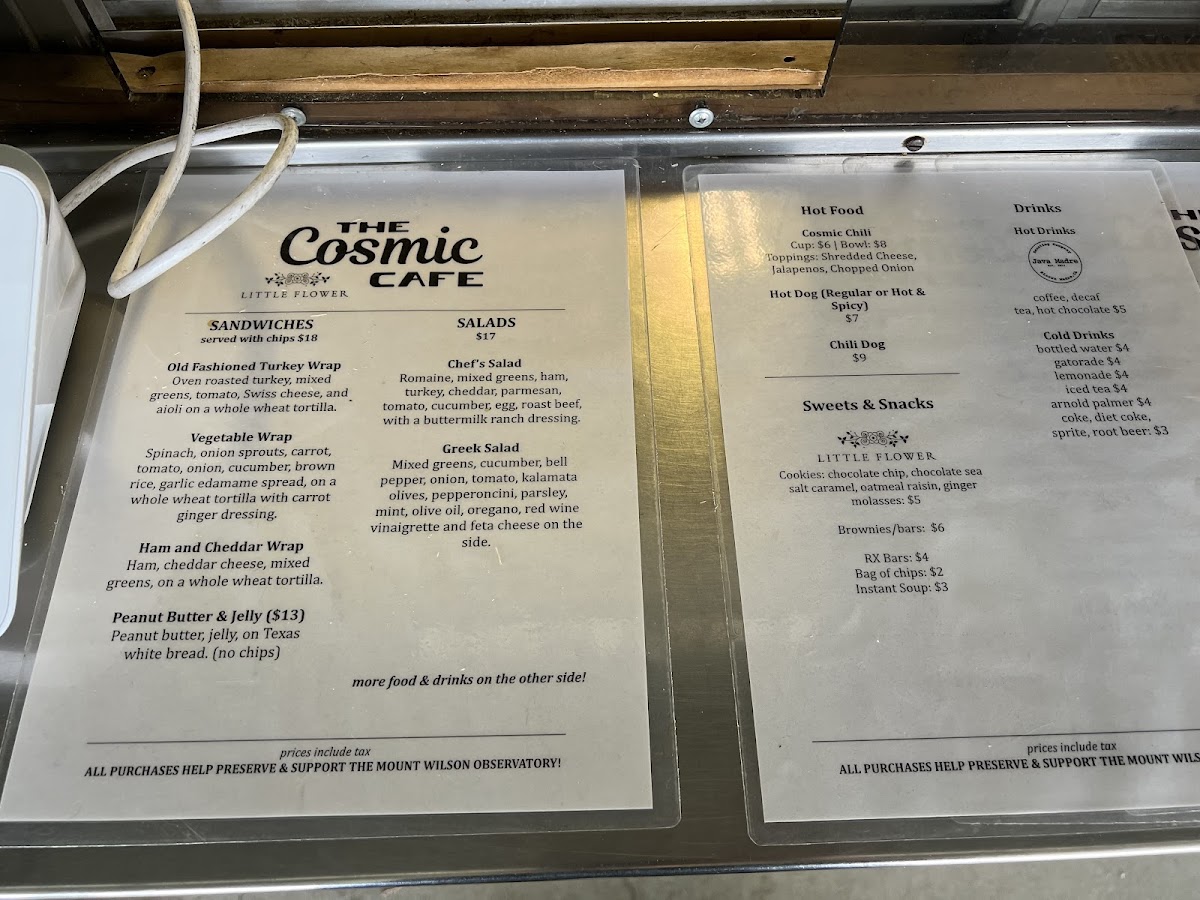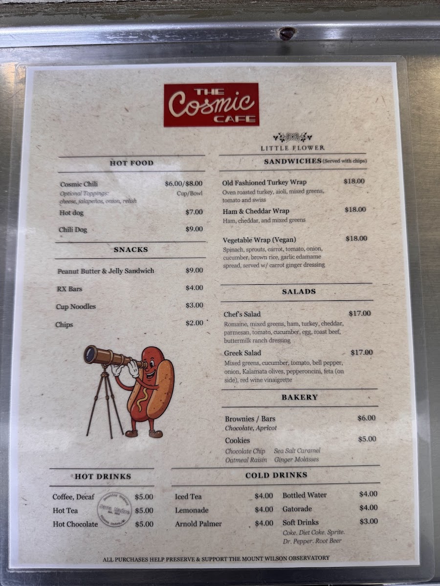 The menu at Cosmic Cafe offers a variety of satisfying options, perfect for a casual outing. For a savory treat, try the Jumbo Dog or the Chili Dog, both hearty choices that are sure to please any hot dog lover. If you're in the mood for something more filling, the Bowl of Chili or the flavorful Frito Pie is a great option. To quench your thirst, the cafe has a selection of cold drinks including Lemonade, Iced Tea, Arnold Palmer, Iced Coffee, and Soda. If you prefer something warm, there are options like Coffee, Tea, and Hot Cocoa to enjoy. For a light snack, there are simple yet satisfying options such as Chips, Candy, Muffin, Fresh Fruit like Apple or Banana, and a classic Chocolate Chip Cookie. This menu, while straightforward, offers a comforting selection that pairs well with a visit to the picturesque Mt. Wilson Skyline Park Picnic Site.